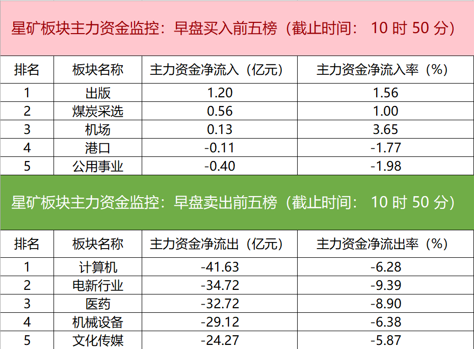 财联社3月22日电,财联社星矿数据显示,今日早盘主力资金净流入出版、煤炭采选、机场等板块,净流出计算机、电新行业、医药等板块,其中计算机板块净流出超41亿元。个股方面,中科曙光上涨,主力资金净买入5.01亿元位居首位,立讯精密、奥飞数据、中原传媒获主力资金净流入居前;药明康德遭净卖出超7亿元,华策影视、中国平安、中兴通讯主力资金净流出额居前。