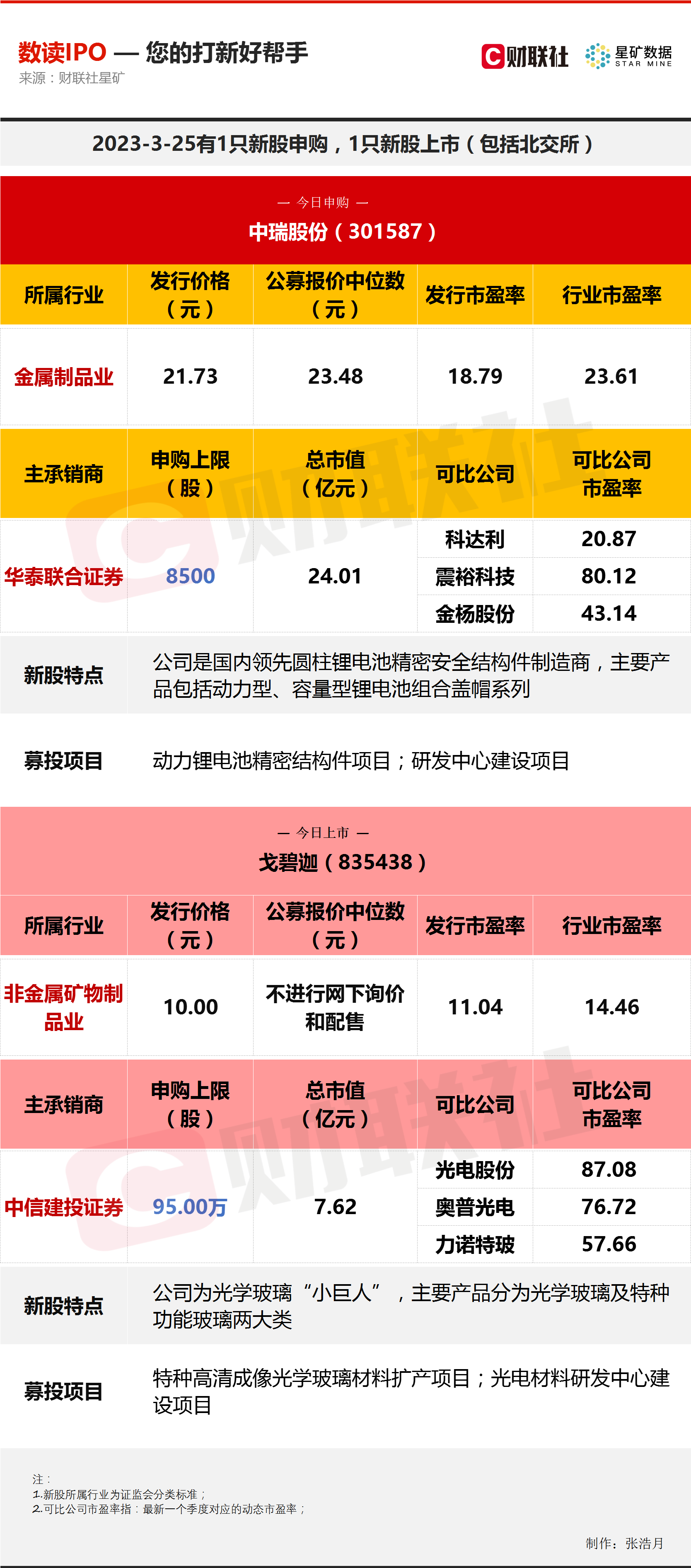 财联社3月25日电,今日有1只新股申购,为创业板的中瑞股份,1只新股上市,为北交所的戈碧迦。