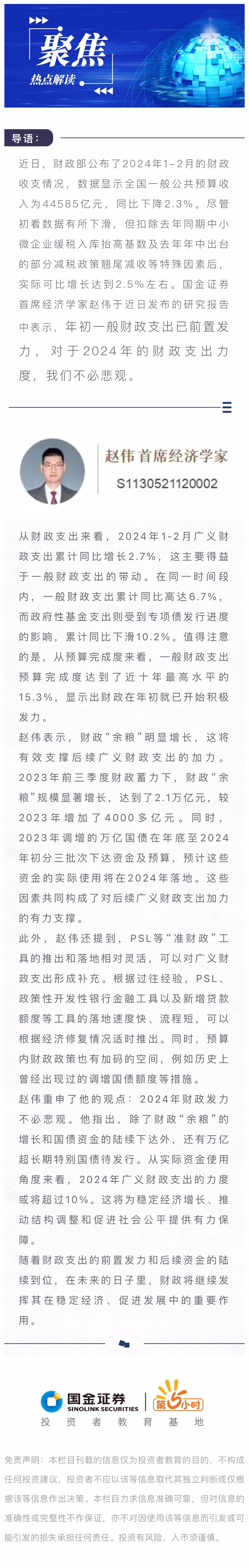 近日,财政部公布了2024年1-2月的财政收支情况,数据显示全国一般公共预算收入为44585亿元,同比下降2.3%。国金证券首席经济学家赵伟于近日发布的研究报告中表示,年初一般财政支出已前置发力,对于2024年的财政支出力度,我们不必悲观。