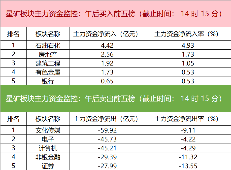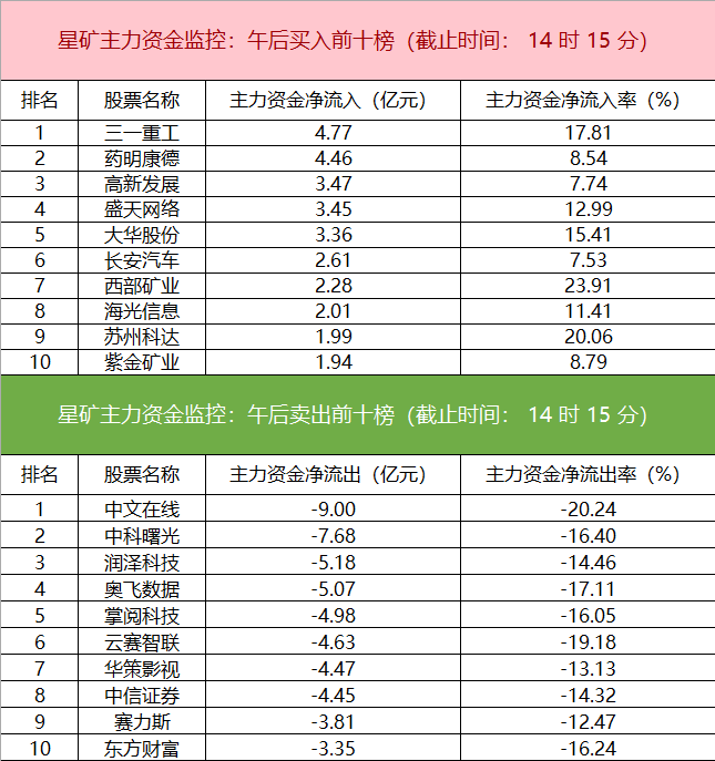 财联社3月25日电,财联社星矿数据显示,今日主力资金净流入石油石化、房地产、建筑工程等板块,净流出文化传媒、电子、计算机等板块,其中文化传媒板块净流出59.92亿元。个股方面,三一重工大涨,主力资金净买入4.77亿元居首位,药明康德、高新发展、盛天网络获主力资金净流入居前;中文在线遭净卖出9.00亿元居净流出首位,中科曙光、润泽科技、奥飞数据等主力资金净流出额居前。