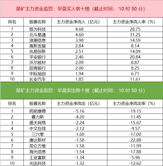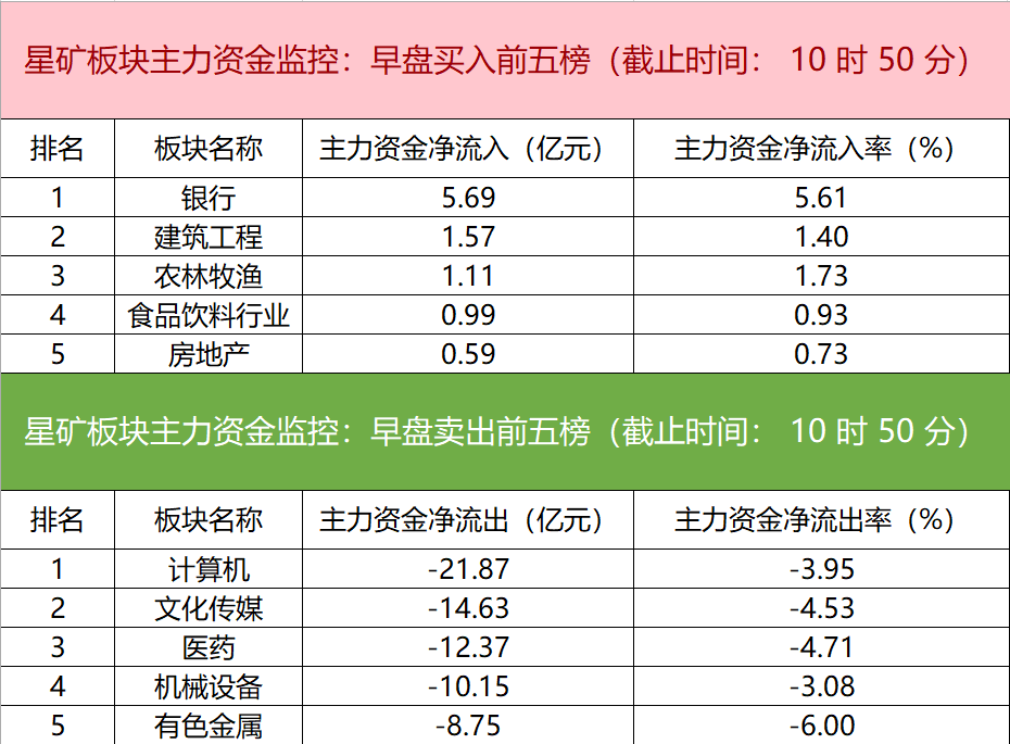 财联社3月26日电,财联社星矿数据显示,今日早盘主力资金净流入银行、建筑工程、农林牧渔等板块,净流出计算机、文化传媒、医药等板块,其中计算机板块净流出超21亿元。个股方面,恒为科技涨停,主力资金净买入4.68亿元位居首位,北斗星通、浪潮信息、高新发展获主力资金净流入居前;药明康德遭净卖出超5亿元,赛力斯、盛天网络、中文在线主力资金净流出额居前。