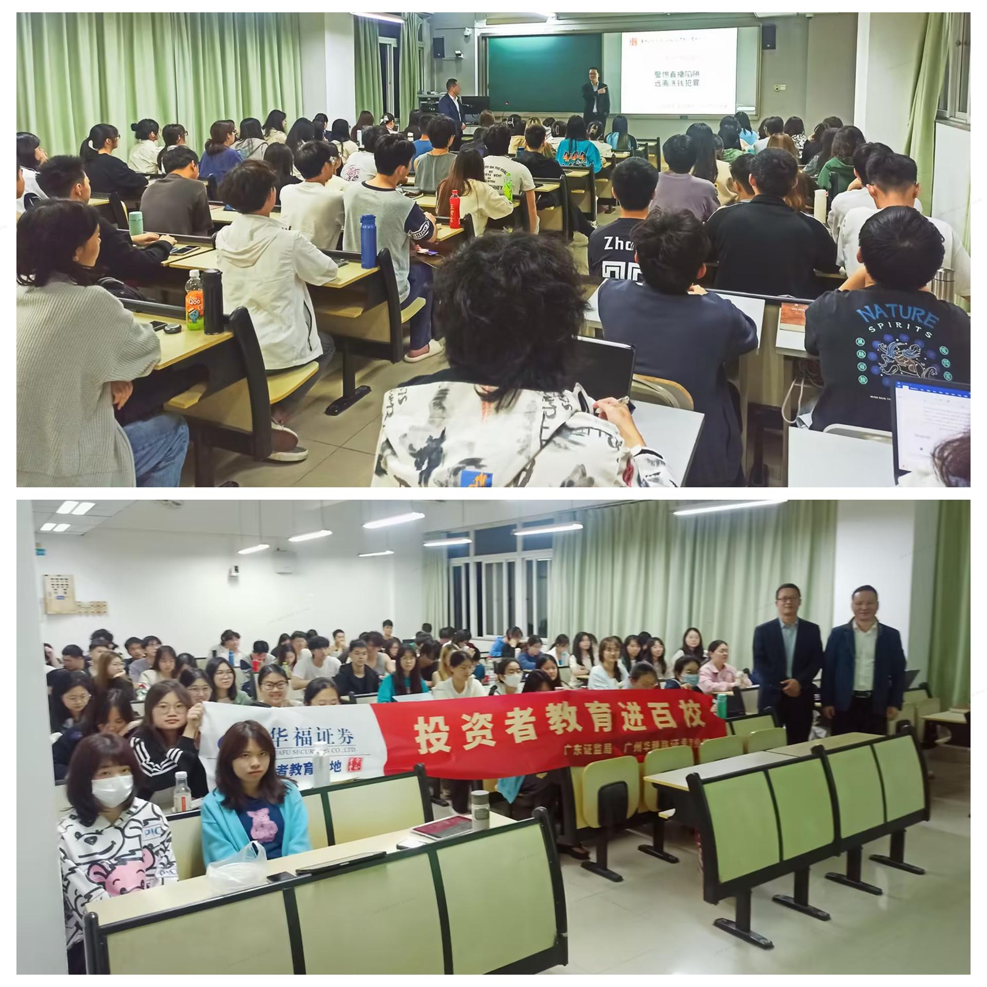 广州华穗路证券营业部负责人黄皓星作为主讲老师,向同学们介绍了中国证券行业的发展历史以及中国特色金融文化,同时针对近期网络直播诈骗案例进行深入剖析,提醒同学们应当增强自我防骗意识,树立正确的投资理念。本次活动得到学校师生一致认可。