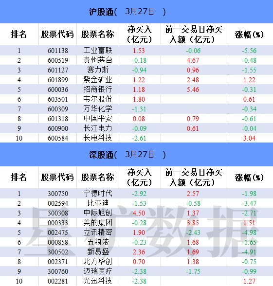 财联社3月27日电,北向资金净卖出72.49亿元,宁德时代、长电科技、光迅科技分别遭净卖出2.92亿元、2.61亿元、2.38亿元;中际旭创逆势获净买入4.5亿元。