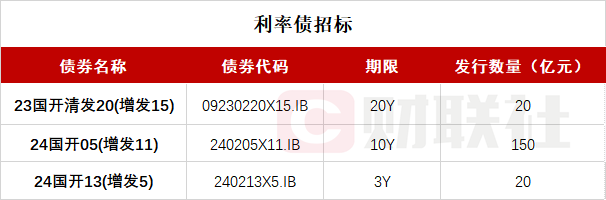 财联社3月28日电,按照此前公布的发行计划,国家开发银行将于09:30-10:30、14:30-15:30分别招标发行三期金融债:国家开发银行2024年第十三期金融债券(第五次增发),期限3年,发行量不超过20亿元,票面利率2.47%;国家开发银行2024年第五期金融债券(第十一次增发),期限10年,发行量不超过150亿元,票面利率2.63%;国家开发银行在上海清算所2023年第二十期金融债券(第十五次增发),期限20年,发行量不超过20亿元,票面利率3.03%。