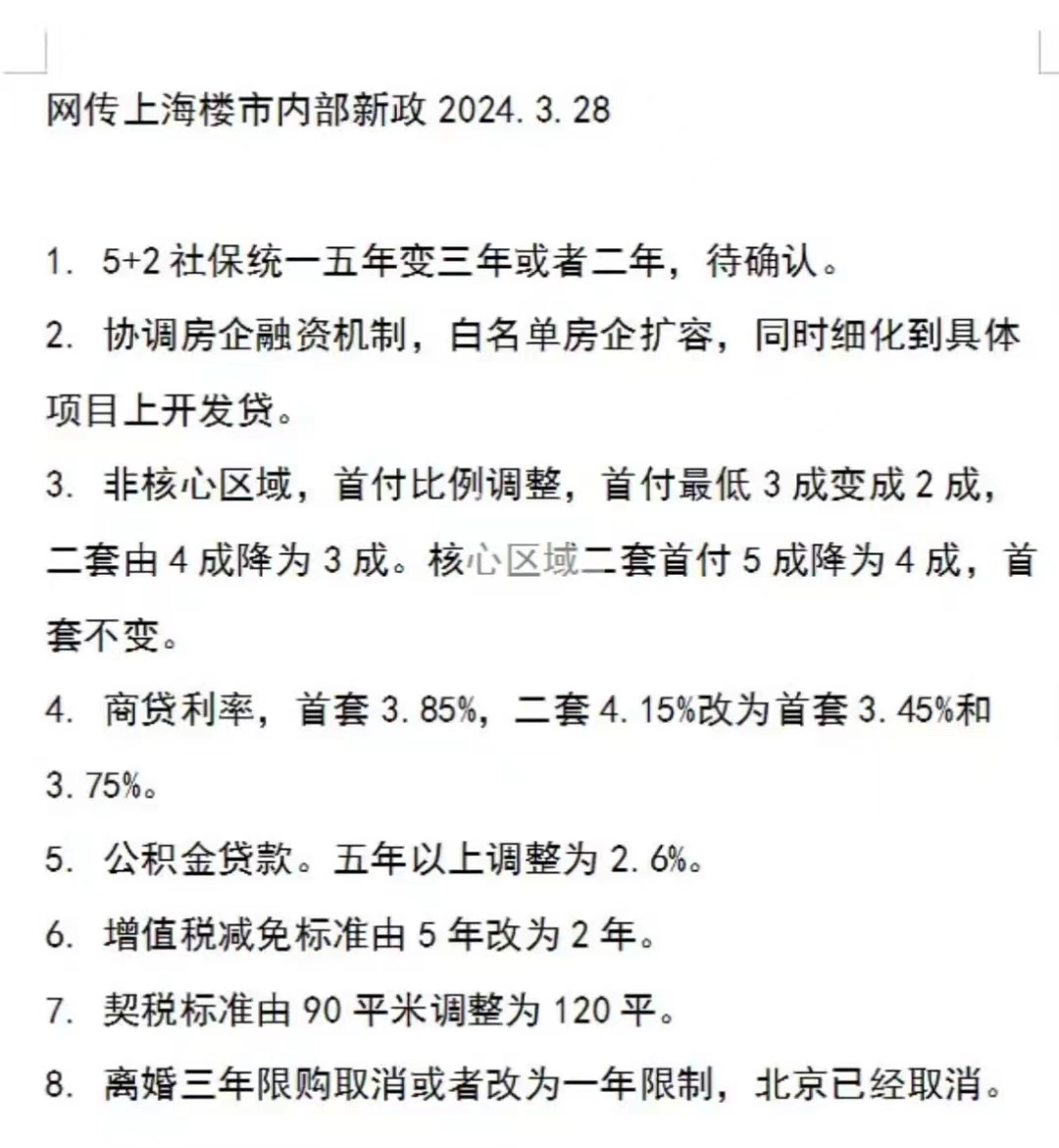 财联社3月28日电,有关上海将出台楼市新政的消息传出,内容包括非核心区域首套房最低首付由3成降为2成,核心区二套房首付由5成降为4成,首套仍为3成;离婚追溯3年限制改为1年限制;首套房、二套房商贷利率分别降为3.45%和3.75%;五年以上公积金贷款利率调整为2.6%等。针对这些信息,蓝鲸记者向上海金山区和杨浦区的住房保障和房屋管理局,及上海多家银行个贷中心致电询问,相关工作人员均表示“未接到通知”,另外上海市公积金管理中心则回应称“维持原来政策”。(蓝鲸财经潘秀林、崔陆鹏)