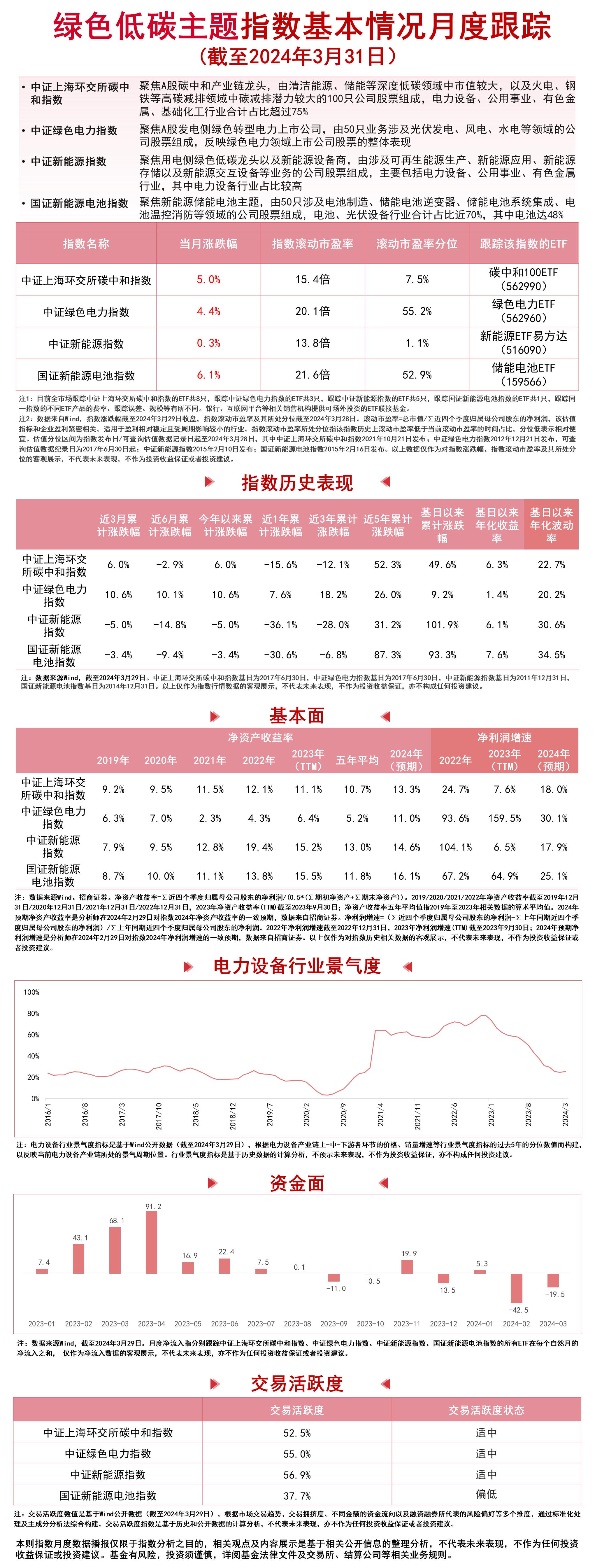 财联社4月1日电,3月,中证上海环交所碳中和指数上涨5.0%,中证绿色电力指数上涨4.4%,中证新能源指数上涨0.3%,国证新能源电池指数上涨6.1%。目前,跟踪国证新能源电池指数的易方达国证新能源电池ETF联接基金(A/C:021033/021034)正在发行中。