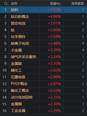 财联社4月2日电,市场全天震荡调整,三大指数均小幅下跌,沪指相对偏强。盘面上,周期股集体走强,其中染料股大涨,七彩化学、亚邦股份、世龙实业等涨停;有色金属概念股持续活跃,北方铜业、精艺股份涨停;油气股表现活跃,准油股份涨停。钛白粉概念股震荡走强,金浦钛业涨停。固态电池概念股午后大涨,三祥新材、东方锆业、利元亨等涨停。下跌方面,AI概念股集体调整,罗博特科20CM跌停,华策影视跌超10%;低空经济概念股午后回落,光启技术跌停,万丰奥威一度跌停。总体上个股跌多涨少,全市场超2900只个股下跌。沪深两市今日成交额9676亿,较上个交易日缩量317亿。板块方面,染料、钛白粉、固态电池、油气等板块涨幅居前,AI语料、多模态、CPO、MR等板块跌幅居前。截至收盘,沪指跌0.08%,深成指跌0.62%,创业板指跌0.62%。北向资金全天净卖出16.18亿,其中沪股通净卖出15.03亿元,深股通净卖出1.15亿元。