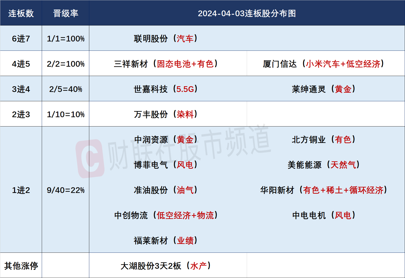 今日共47股涨停,连板股总数15只,其中三连板及以上个股6只,上一交易日共21只连板股,连板股晋级率28.57%(不含ST股、退市股及未开板新股)。个股方面,全市场超3400只个股下跌,高位股大幅退潮,昨9连板华生科技、昨5连板普路通、华体科技均封死跌停,此外晋级7连板的联明股份曾一度炸板,晋级5连板的三祥新材、厦门信达均在盘中剧震,其中厦门信达上演“地天板”。板块方面,大宗商品市场气势如虹,黄金、原油、铜等品种纷纷上涨,其中国际金价一度突破2300美元/盎司,再创历史新高,有色金属、贵金属板块强者恒强,北方铜业4天3板,飞南资源、恒光股份20CM涨停;铜缆高速连接、AI语料、飞行汽车等前期热门题材皆大幅回调,金盾股份、读客文化、双一科技等人气股跌超10%。