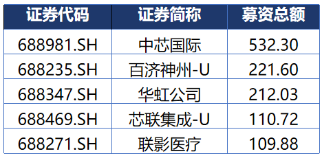 科创板570家公司合计首发募集资金总额9,081.56亿元。科创板公司平均募集资金金额为15.96亿元,最大值为中芯国际532.3亿元,中位数为9.96亿元。