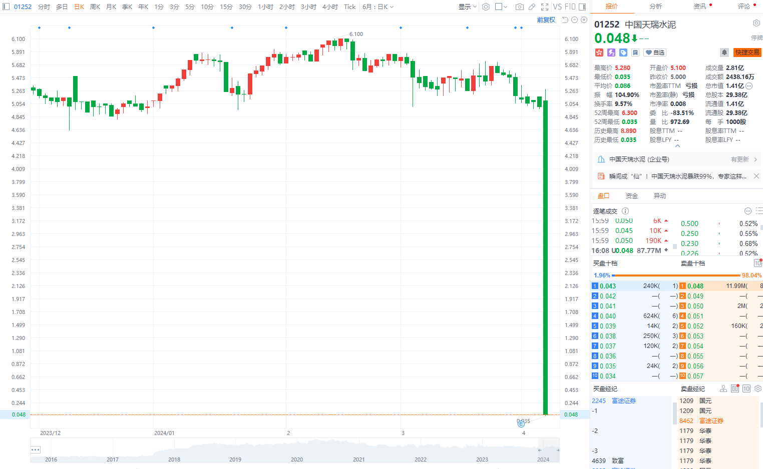 财联社4月10日电,中国天瑞水泥在港交所公告,将于今天上午九时起短暂停止买卖,以待发出有关公司内幕消息的公告。昨日,中国天瑞水泥股价暴跌99%。