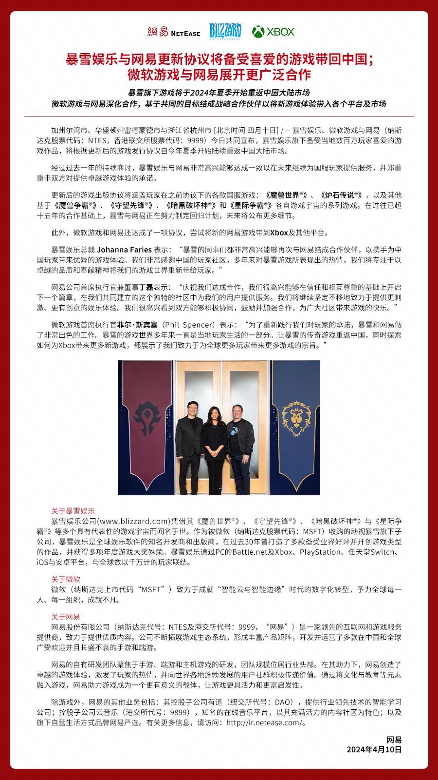 财联社4月10日电,据网易游戏微博消息,暴雪娱乐、微软游戏与网易今日共同宣布,暴雪旗下游戏将于2024年夏季重返中国大陆市场。微软游戏和网易还达成了一项协议,尝试将新的网易游戏带到Xbox及其他平台。