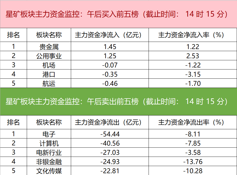 财联社4月10日电,财联社星矿数据显示,今日主力资金仅净流入贵金属和公用事业板块,净流出电子、计算机、电新行业等板块,其中电子板块净流出54.44亿元。个股方面,长江电力上涨,主力资金净买入4.91亿元居首位,宗申动力、深中华A、中润资源获主力资金净流入居前;药明康德遭净卖出4.93亿元居净流出首位,赛力斯、万科A、三祥新材等主力资金净流出额居前。