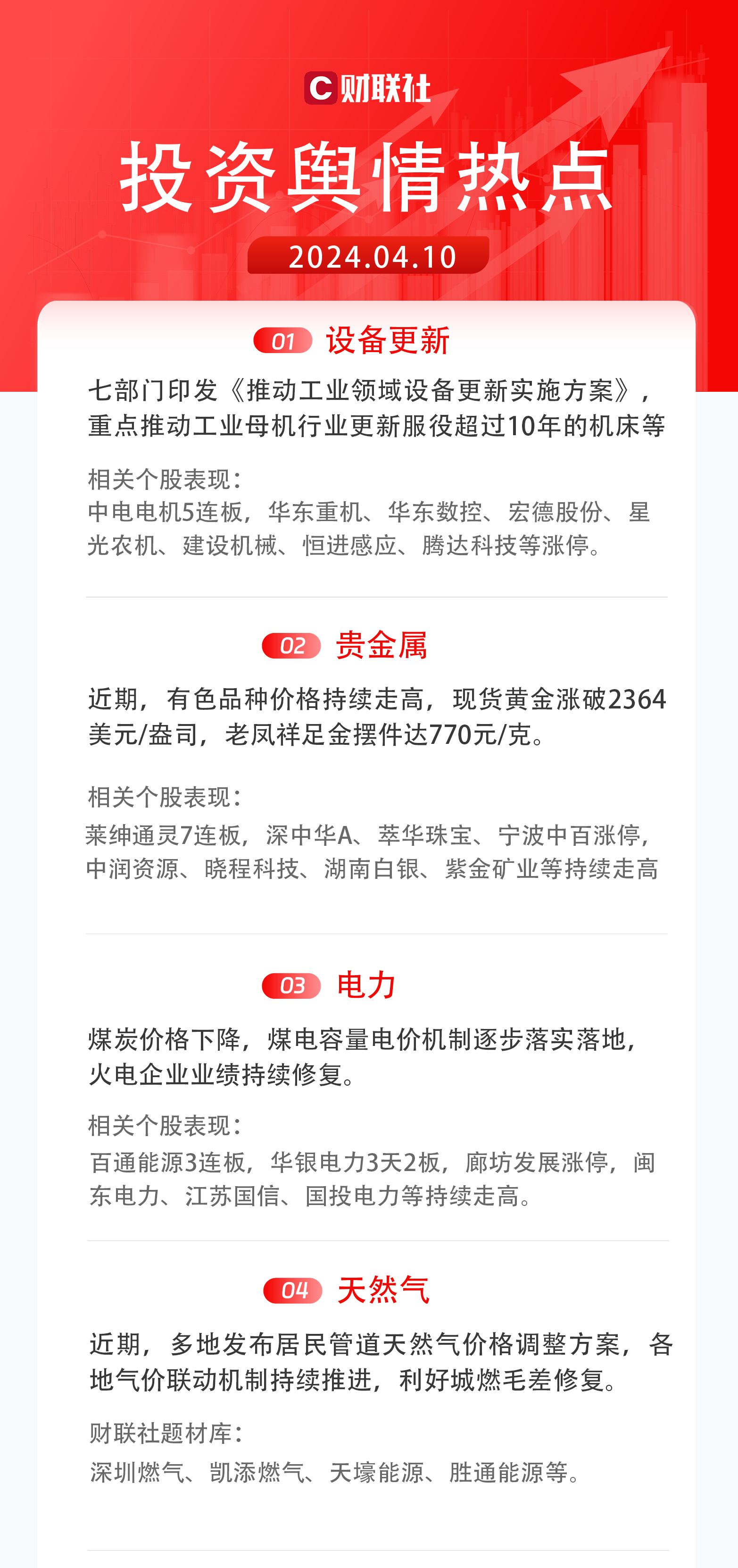 2)贵金属:近期,有色品种价格持续走高,现货黄金涨破2364美元/盎司,老凤祥足金摆件达770元/克。