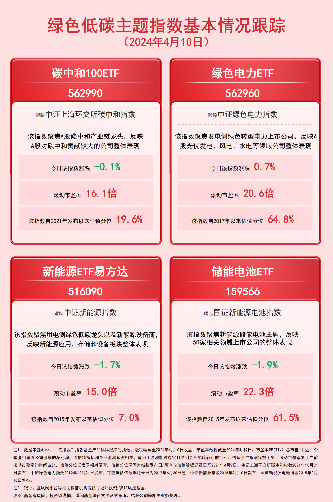财联社4月10日电,截至今日收盘,中证绿色电力指数上涨0.7%,中证上海环交所碳中和指数下跌0.1%,中证新能源指数下跌1.7%,国证新能源电池指数下跌1.9%。