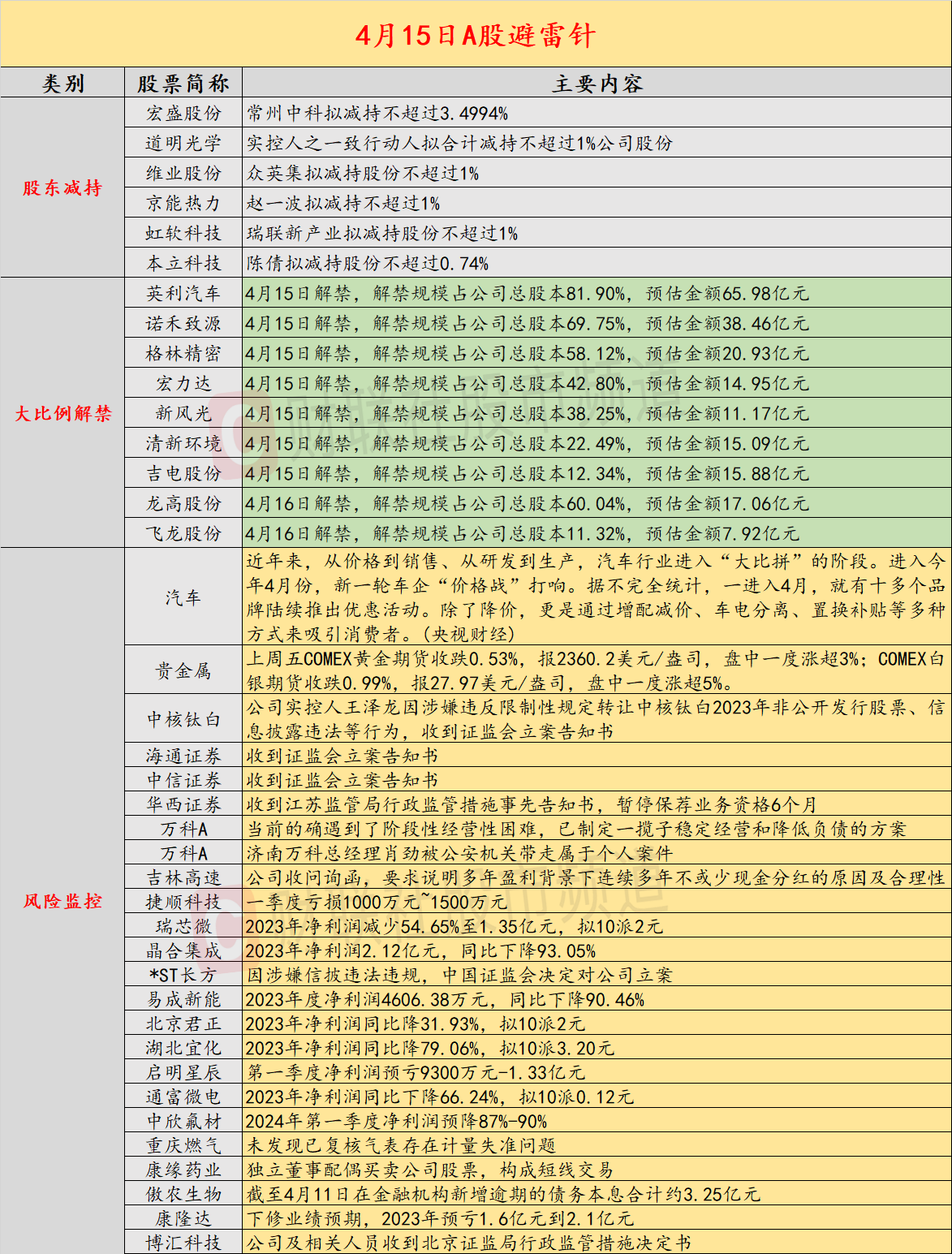 近日公告的A股拟减持的公司数量较之前有所增多,宏盛股份股东常州中科拟减持不超过3.4994%;英利汽车、诺禾致源将迎来超六成以上解禁;证监会对申报、撤单的笔数、频率达到一定标准的程序化交易,可提高收费标准;因转让中核钛白2023年非公开发行股票过程中涉嫌违法违规,海通证券、中信证券收到证监会立案告知书;4月车企掀起新一轮价格战,多个汽车品牌推出优惠活动;华西证券涉嫌在金通灵2019年非公开发行股票保荐项目中存在违规行为,收到江苏监管局行政监管措施事先告知书,暂停保荐业务资格6个月;英美对俄罗斯金属实施制裁,禁止LME、CME等接受铝、铜、镍。