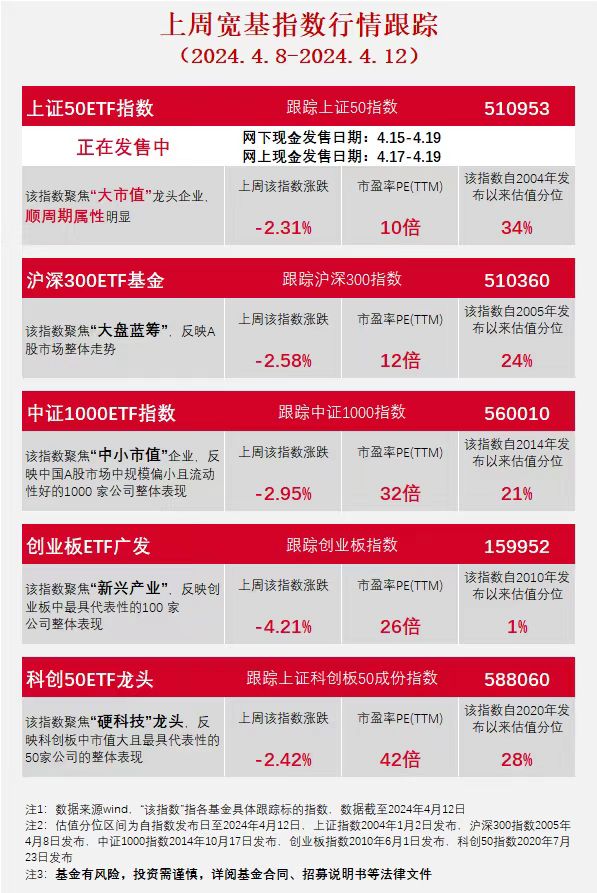 财联社4月15日电,上周,A股震荡持续,主要指数下跌盘整,沪深300累跌-2.58%,中证1000累跌-2.95%。双创齐挫,科创50跌-2.42%,创业板指跌-4.21%。分板块看,申万一级行业中,公用事业(+2.26%)、煤炭(+1.86%)、有色金属(+1.56%)等顺周期板块走势强劲,聚焦顺周期龙头企业的上证50指数周跌-2.31%,在各宽基中抗跌属性凸显。把握经济复苏投资机会,上证50ETF指数(510953)今日发售,管理费率0.15%,为全市场挂钩上证50指数同类ETF中费率最低档水平。