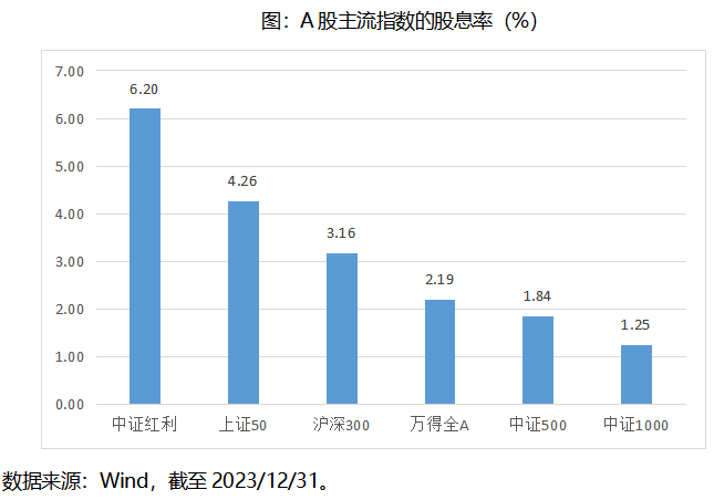 高股息率是红利指数最突出的特点,如下图数据,中证红利指数的股息率显著高于上证50、沪深300等主流指数。