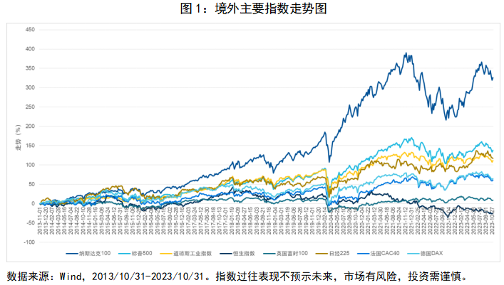 近些年,纳斯达克100指数(以下简称“纳指100”)的表现在一众境外指数中引人注目。从2013年10月31日到2023年10月31日的十年间,纳指100涨幅达326.35%,而同时期的标普500和道琼斯工业指数涨幅分别为138.06%和111.67%。