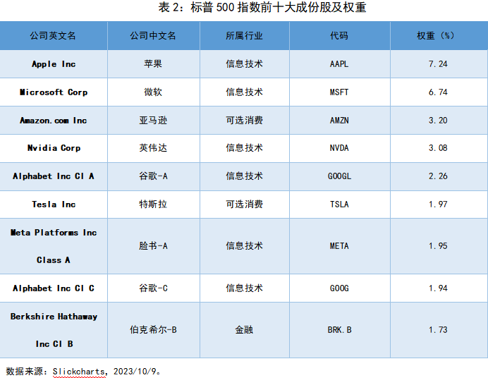 标普500指数由标准普尔公司编制和发布,包含了约500家公司,成份股总市值约40.24万亿(数据来源:Wind,2023/10/11),占据美国股市总市值的约70%。