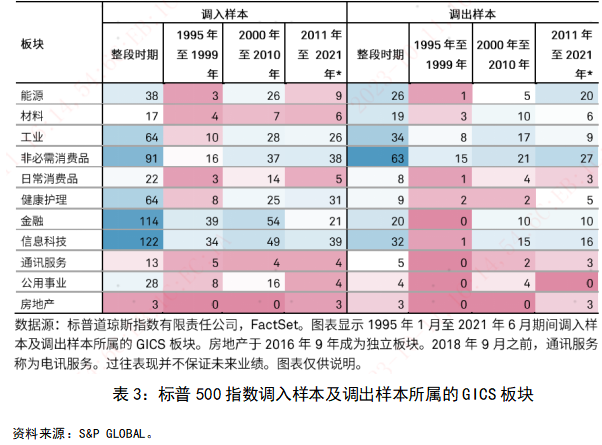 在样本股调整方面,从表3可见,从1995年至2021年间,调入样本股多来自于信息科技及金融板块。比如,随着科技的进步,尤其是互联网技术和应用的发展,谷歌和脸书等新兴行业龙头上市公司市值不断提升,陆续被纳入标普500成份股;另一方面,调出的成份股的上市公司多出自传统消费品和传统制造业。