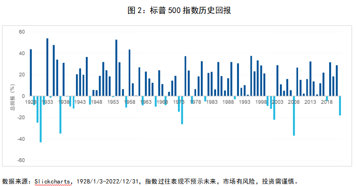 如图2所示,标普500指数的长期历史回报表现,总体比较可观,自1928年至2022年,73%的自然年度指数都获得正回报。