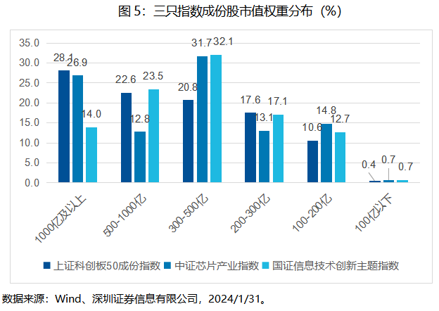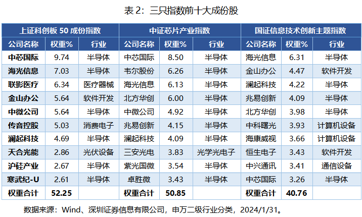 【要点:科创50指数主要成份股集中在科创龙头公司,中证芯片产业指数聚焦芯片,国证信创指数集中度较低】