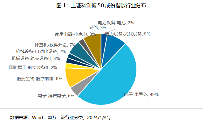 科创50指数聚焦国内最具代表性的优质科技创新龙头企业,目前覆盖了19个申万二级行业,前三大行业分别为半导体(49%)、光伏设备(9%)和医疗器械(9%)。