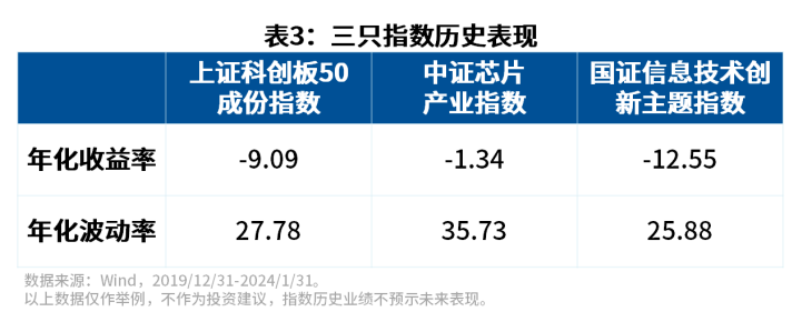 三只指数均为大中盘风格成长性指数,风险相对较高。科创50聚焦“硬科技”龙头,行业分布较广,反映科创板中市值大、流动性好的50家公司的整体表现;芯片产业指数聚焦芯片龙头,反映A股芯片产业上市公司整体表现;国证信息技术创新主题指数聚焦“信创”龙头,反映A股信创主题上市公司的整体表现。