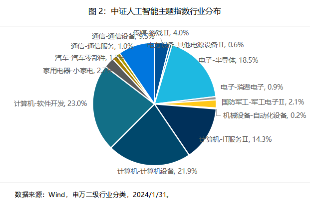 人工智能指数一定程度侧重于人工智能产业链的全方位覆盖,所涉及的行业既包括算力环节相关的电子、通信行业,也有大模型和应用相关的计算机、传媒、汽车等领域,行业分布相对均匀。