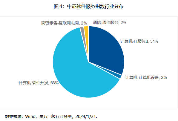 软件服务指数成份股大部分聚焦于下游的软件开发,96%的上市公司来自软件应用相关的计算机行业。