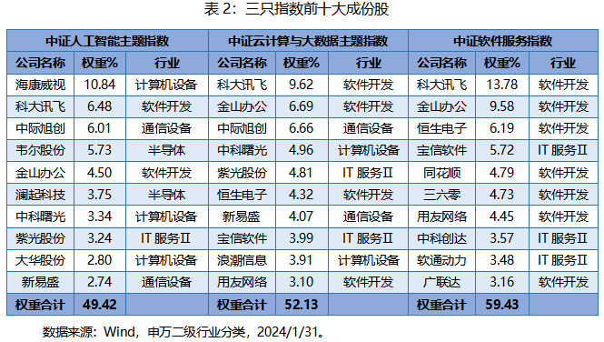 三只指数前十大重仓股中,有部分行业龙头企业股票互相重合,如科大讯飞、金山办公、紫光股份等,三只指数受行业龙头企业表现的影响都比较大。
