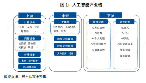 人工智能产业链可细分为上游算力环节、中游模型环节、下游应用环节三个环节: