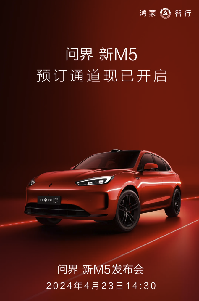 财联社4月17日电,AITO汽车4月17日宣布,问界新M5现已开启预订。据介绍,问界新M5发布会将于2024年4月23日14:30举办。