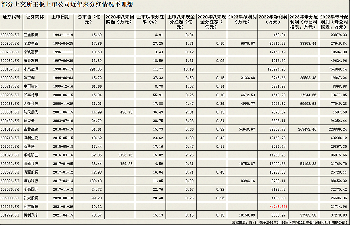据此,界面新闻根据Wind数据统计显示,截至2024年4月16日,合计1697家上交所主板上市公司中,有22家公司近年来分红情况不理想。
