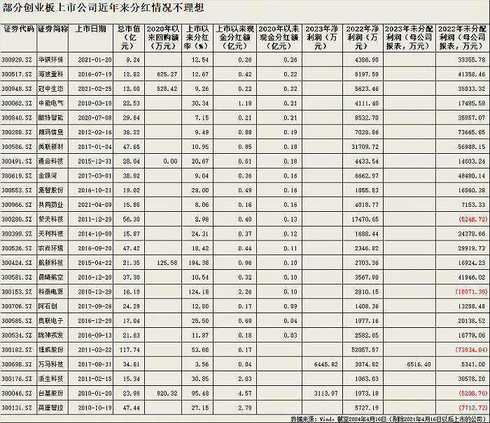 据此,界面新闻根据Wind数据统计显示,截至2024年4月16日,合计1343家创业板上市公司中,有24家公司近年来分红情况不理想。