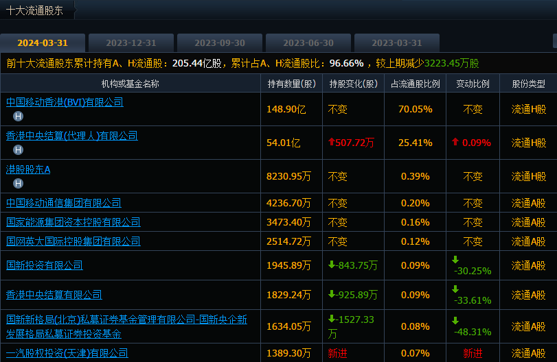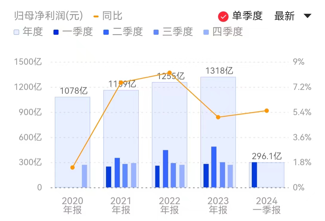 财联社4月22日电,中国移动公布2024年第一季度报告,报告期内,公司实现营业收入2637亿元,同比增长5.2%;归属于母公司股东的净利润296亿元,同比增长5.5%;基本每股收益1.38元。小财注:2023年Q4净利262.6亿元,据此计算,2024年Q1净利环比增长12%。