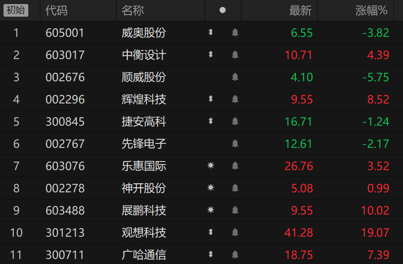 财联社4月23日电,市场焦点股威奥股份(4板)低开3.82%,低空经济概念股中衡设计(4板)高开4.39%、顺威股份(4天2板)低开5.75%,业绩增长的辉煌科技(4天3板)高开8.52%、捷安高科(创业板2板)低开1.24%、先锋电子(4天2板)低开2.17%,食品饮料板块乐惠国际(4天3板)高开3.52%,油气股神开股份(2板)高开0.99%,军工股展鹏科技(4天2板)竞价涨停、观想科技(创业板首板)高开19.07%、广哈通信(创业板首板)高开7.39%。