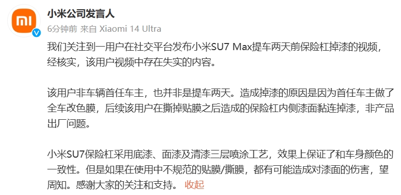 小米回应“SU7 Max提车两天前保险杠掉漆”视频:存在失实内容 该用户非车辆首任车主