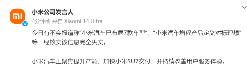 小米回应:“小米汽车已布局7款车型、增程产品定义对标理想”为不实报道