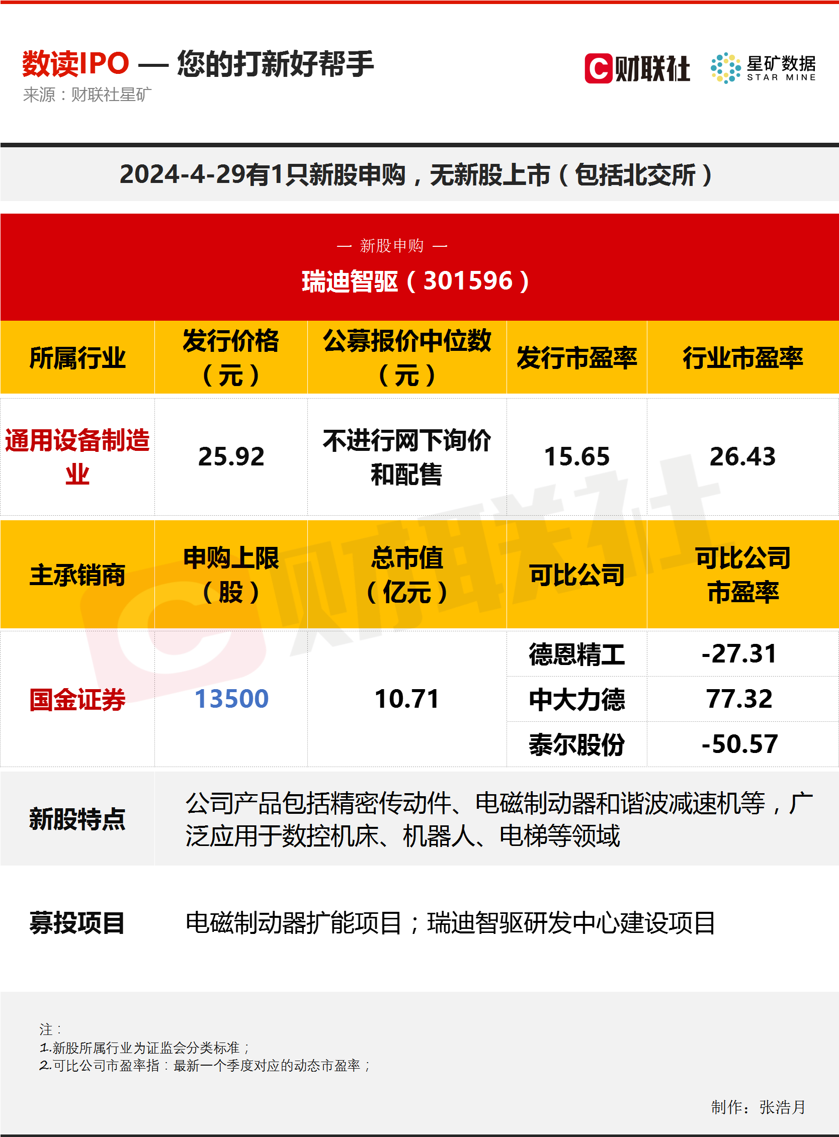 财联社4月29日电,今日有1只新股申购,为创业板的瑞迪智驱;无新股上市。瑞迪智驱产品包括精密传动件、电磁制动器和谐波减速机等,广泛应用于数控机床、机器人、电梯等领域。