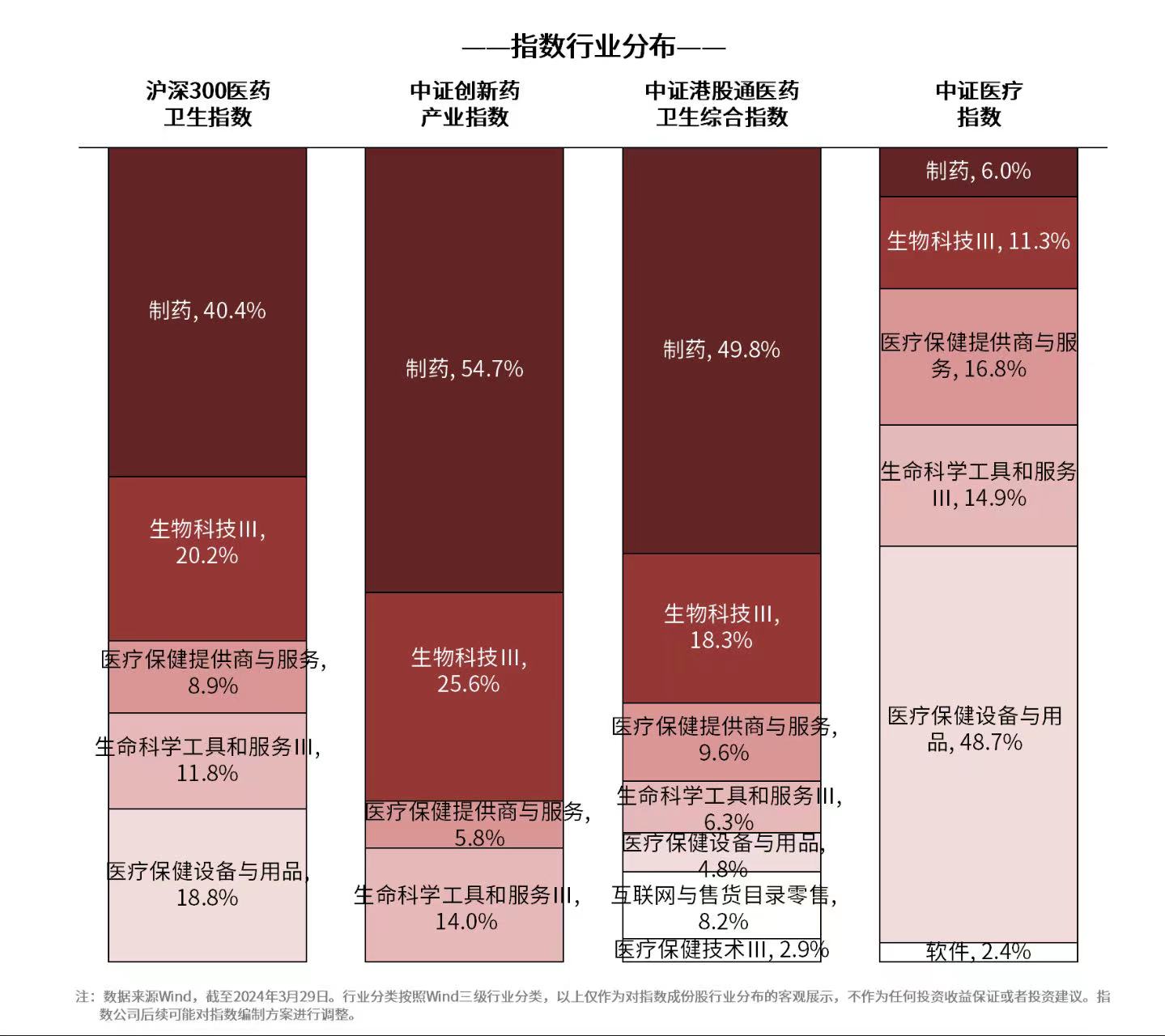 财联社4月29日电,截至14:00,中证医疗指数上涨2.6%,沪深300医药卫生指数上涨2.5%,中证创新药产业指数上涨1.7%,中证港股通医药卫生综合指数上涨1.9%。从行业分布来看,沪深300医药卫生指数聚焦A股医药卫生行业龙头,前三大权重行业为制药、生物科技、医疗保健设备与用品;中证创新药产业指数聚焦A股创新药产业链龙头,制药为第一大权重行业,占比超50%;中证港股通医药卫生综合指数聚焦港股通范围内的医药卫生行业龙头;中证医疗指数聚焦A股医疗器械及医疗服务龙头,医疗保健设备与用品为第一大权重行业,占比近50%。医药ETF(512010)、创新药ETF易方达(516080)、港股通医药ETF(513200)、医疗50ETF(159847)等跟踪医药主题相关指数的产品,可助力投资者布局医药卫生板块龙头。