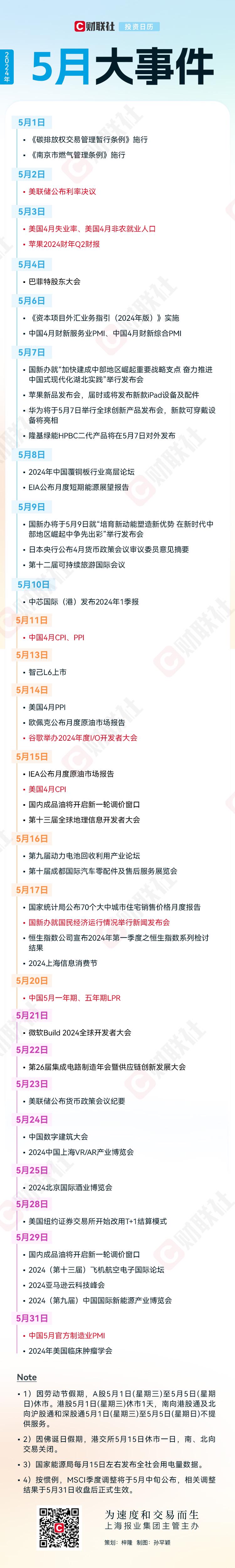 投资日历:5月资本市场大事提醒