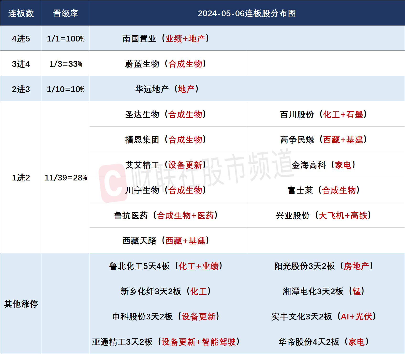 今日共88股涨停,连板股总数14只,其中三连板及以上个股3只,上一交易日共14只连板股,连板股晋级率21.42%(不含ST股、退市股及未开板新股)。个股方面,全市场超4500只个股上涨,逾百股涨停或涨超10%,ST股集体大跌,近60股跌停。连板股方面,南国置业一字涨停晋级5连板,向上打开连板高度,但由于题材快速轮动,连板股2进3晋级率仅10%。板块方面,合成生物概念人气居高不下,蔚蓝生物4连板,圣达生物4天3板,川宁生物、富士莱20CM2连板,作为新质生产力非常重要的新赛道和新业态,尚处于低位的合成生物概念开始被市场大规模挖掘;化工股盘中爆发,鲁北化工5天4板,七彩化学、联合化学、正丹股份20CM涨停,中信证券研报指出,近期部分化工产品价格快速上涨,产品利润明显改善,引发市场关注。