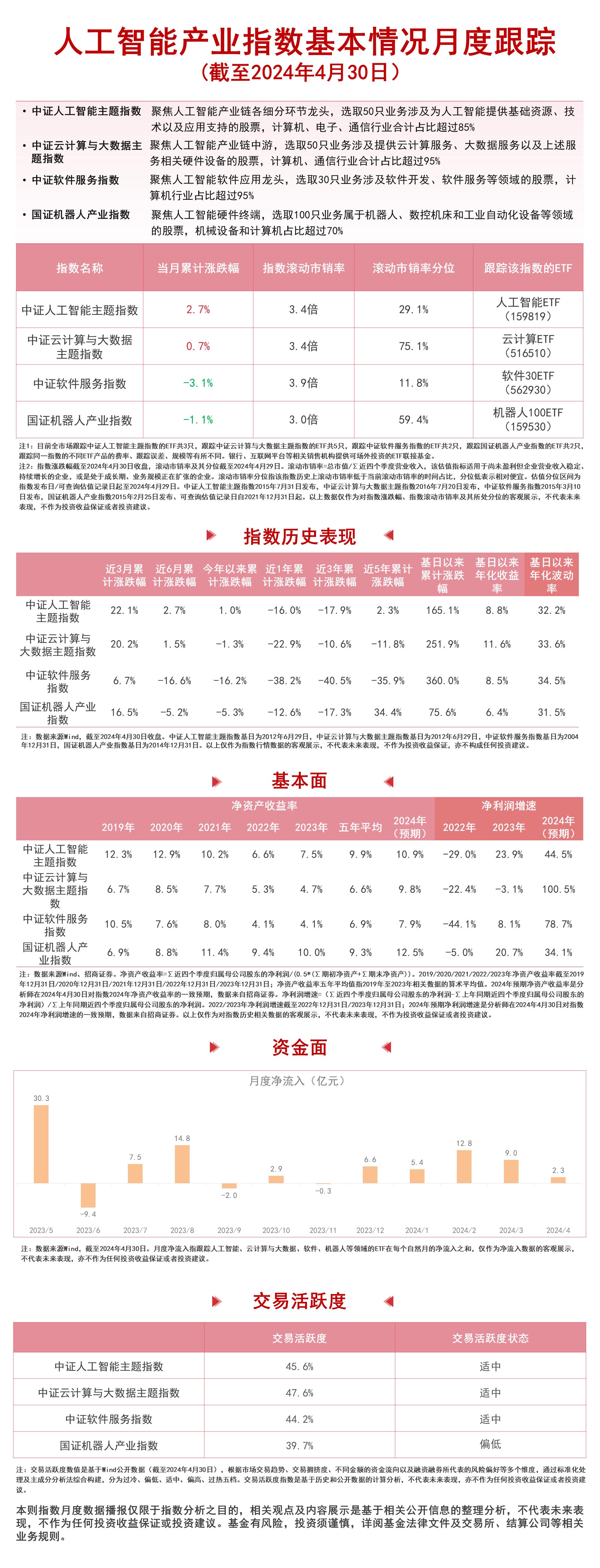 昨日,《武汉市加快数字内容产业发展三年行动计划(2024-2026年)》印发,目标到2026年,以数字内容为代表的文化新业态特征较为明显的行业领域营业收入突破2000亿元,相关文化新业态领域增加值占全市文化产业增加值比重超过60%,对地区GDP贡献率达到3%左右,初步建成国家数字内容产业高地。银河证券表示,数字中国等政策不断加码、AI新应用持续推新的背景下,数字经济新基建夯实助力算力网络升级,通信及AI新基建板块有望预期上修。相关指数的配置价值受到市场关注。其中,中证人工智能主题指数聚焦人工智能产业链各细分环节龙头;中证云计算与大数据主题指数聚焦人工智能产业链中游,计算机、通信行业占比较高;中证软件服务指数更侧重产业链中游的大模型和下游的软件应用。人工智能ETF(159819)、云计算ETF(516510)、软件30ETF(562930)等产品,可助力投资者布局产业链龙头。