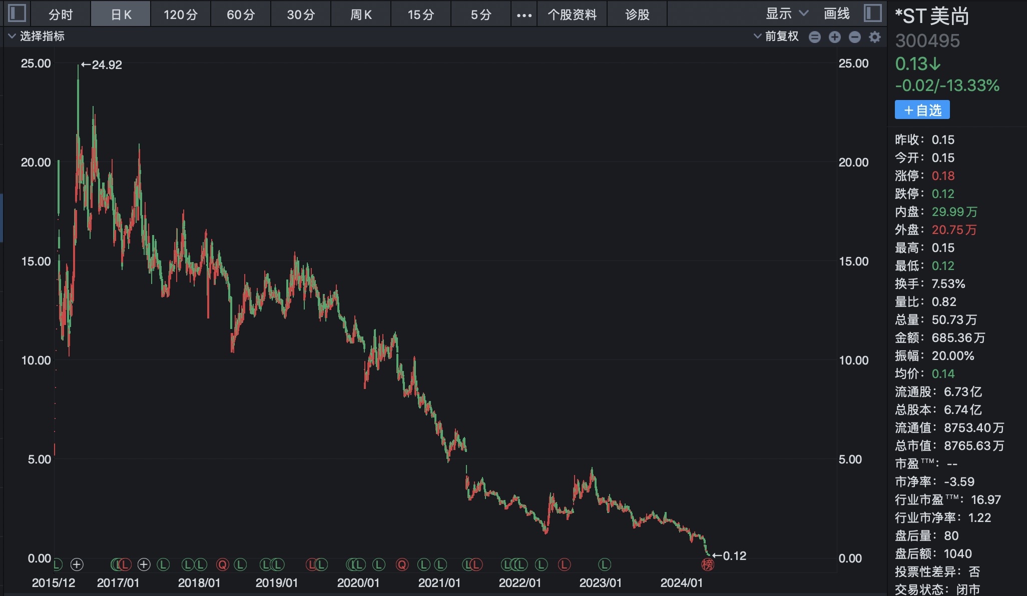 财联社5月8日电,*ST美尚公告,截至2024年5月8日,公司股票收盘价连续二十个交易日低于1元,公司股票将被深圳证券交易所终止上市交易。公司股票将自2024年5月9日(周四)开市起停牌。同日发布澄清公告,目前,公司与实际控制人王迎燕保持正常联系及沟通中,王迎燕仍在中国境内,其为中国国籍,无境外永久居留权。相关媒体的报道严重与事实不符,其未从相关专业角度出发,在未全面、客观了解相关事实的情况下,通过其自身不实的判断做出报道,存在故意误导的嫌疑,严重侵犯了公司的声誉。对于制造散布此类不实信息的行为,公司将保留依法追究相关企业和人员法律责任的权利。小财注:*ST美尚收盘报0.13元/股,股价自2015年历史高点迄今累计最大跌幅约99.5%。*ST美尚4月21日盘后公告因信披违规被证监会立案。据统计,公司自2012年至2020年连续9年虚增利润合计4.57亿元。此外,*ST美尚实控人王迎燕曾因联合私募操纵自家股票被证监会行政处罚,累计交易额近800亿元。数据显示,截至3月31日王迎燕持有17.87%公司股份,为公司第一大股东。
