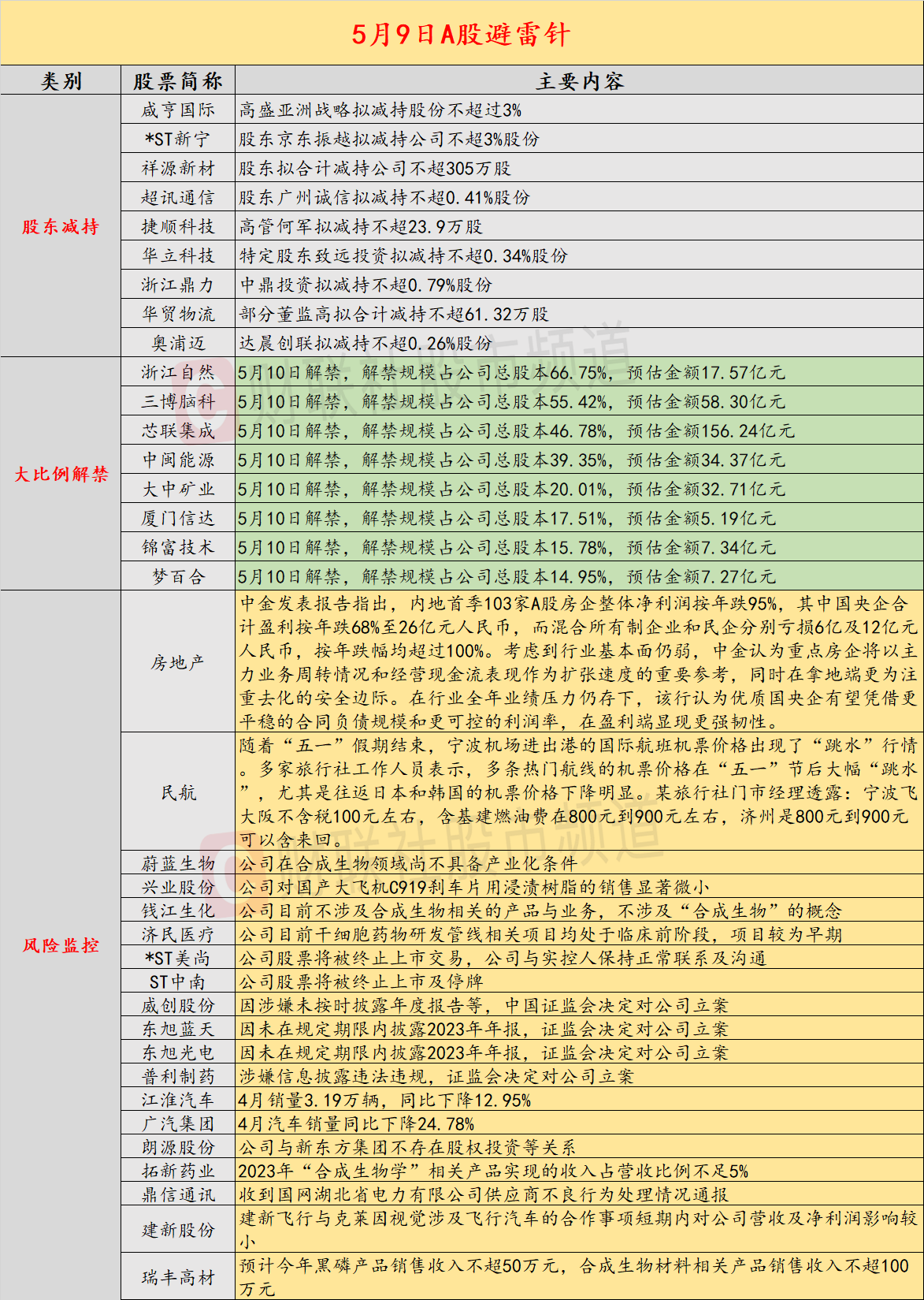昨日公告的A股拟减持的公司数量较之前有所增多,咸亨国际股东高盛亚洲战略拟减持股份不超过3%,*ST新宁股东京东振越拟减持公司不超3%股份;浙江自然、三博脑科将迎来超五成以上解禁;郑商所提示风险,假期结束国际机票价格大幅回落,宁波往返济州最低跌至800元;6连板蔚蓝生物公告,公司在合成生物领域尚不具备产业化条件;中金报告指出,重点内房企业首季盈利跌约五成,行业全年业绩压力仍存;4连板兴业股份称公司对国产大飞机C919刹车片用浸渍树脂的销售显著微小;美股三大指数收盘涨跌不一,大型科技股互有涨跌。