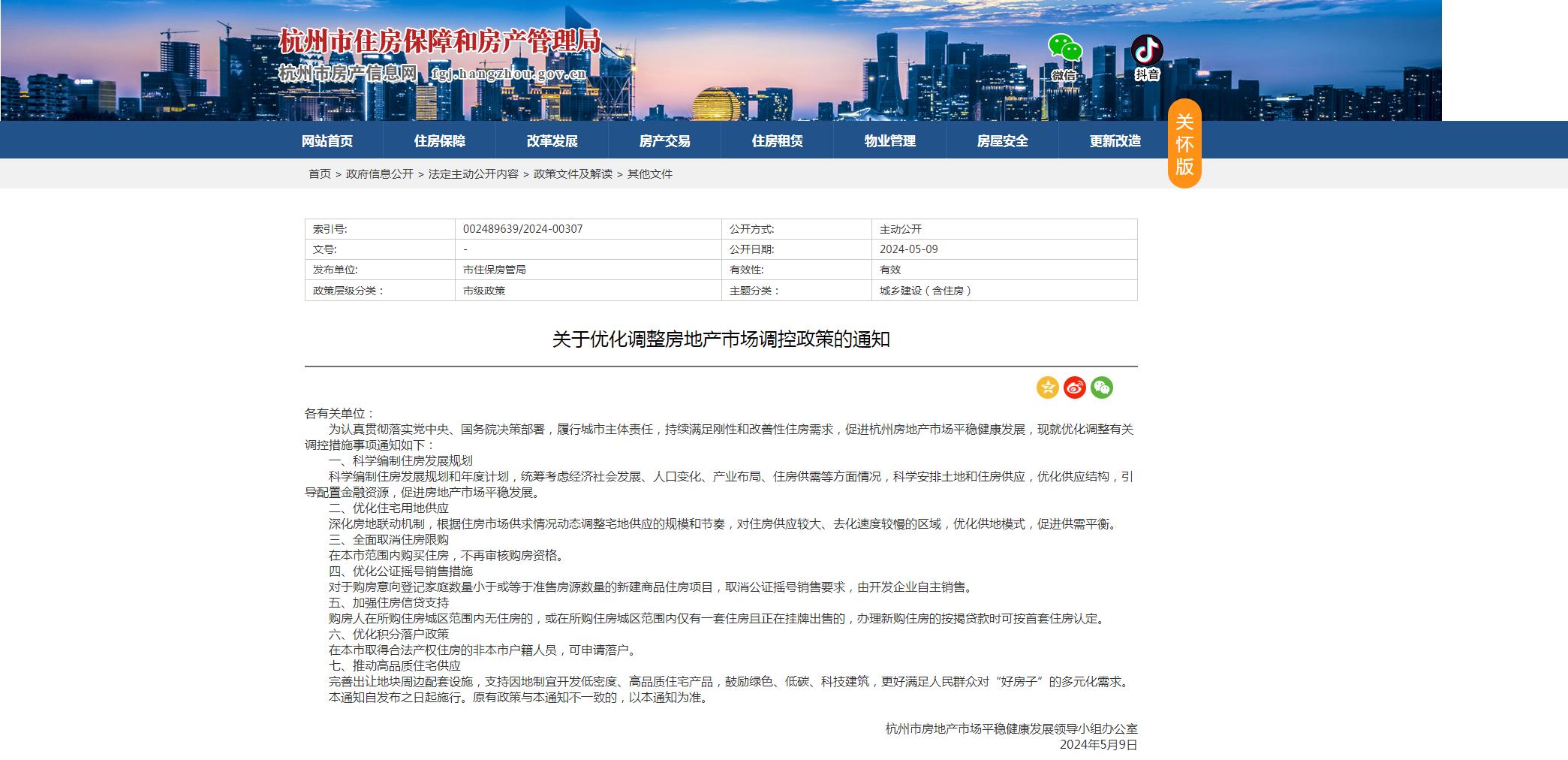 财联社5月9日电,杭州市房地产市场平稳健康发展领导小组办公室5月9日发布《关于优化调整房地产市场调控政策的通知》,其中提到,全面取消住房限购,在本市范围内购买住房,不再审核购房资格。对于购房意向登记家庭数量小于或等于准售房源数量的新建商品住房项目,取消公证摇号销售要求,由开发企业自主销售。购房人在所购住房城区范围内无住房的,或在所购住房城区范围内仅有一套住房且正在挂牌出售的,办理新购住房的按揭贷款时可按首套住房认定。在本市取得合法产权住房的非本市户籍人员,可申请落户。