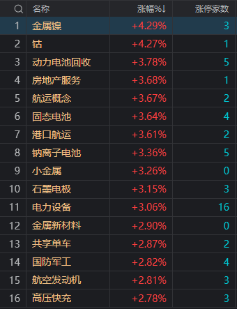 财联社5月9日电,市场全天震荡反弹,创业板指领涨,沪指、深成指均再创年内新高。盘面上,锂电池等新能源赛道股开盘反弹,天力锂能、领湃科技、合纵科技、天际股份等10余股涨停。航运股集体走强,凤凰航运、中远海发涨停。房地产板块盘中拉升,空港股份、广宇集团涨停。细胞免疫治疗概念股维持强势,泰林生物、开能健康、中源协和等涨停。低空经济概念股震荡反弹,四创电子、上工申贝、山东矿机涨停。下跌方面,染料股陷入调整,联合化学跌近10%。总体上个股涨多跌少,全市场超4200只个股上涨。沪深两市今日成交额9011亿,较上个交易日放量367亿。板块方面,航运、电力设备、军工、细胞免疫治疗等板块涨幅居前,染料、ST板块、合成生物、教育等板块跌幅居前。截至收盘,沪指涨0.83%,深成指涨1.55%,创业板指涨1.87%。北向资金全天净买入80.14亿,其中沪股通净买入39.25亿元,深股通净买入40.9亿元。