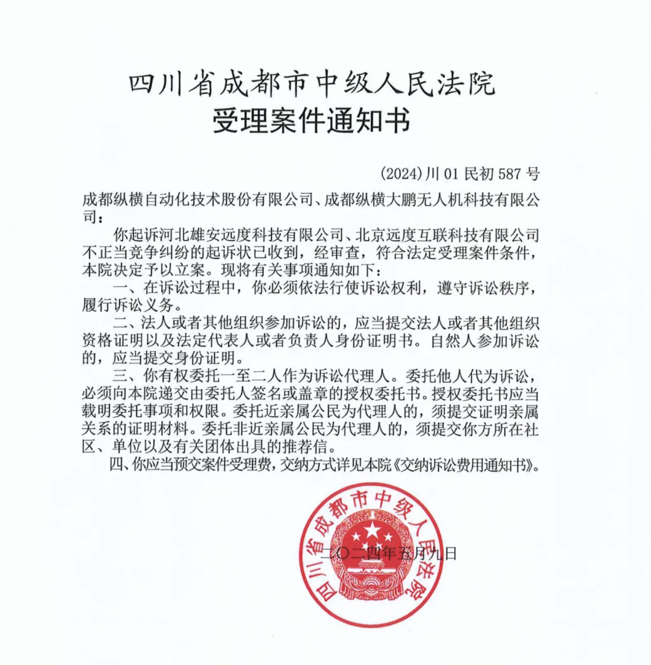 同时,纵横股份发布了四川省成都市中级人民法院《受理案件通知书》。该《通知书》显示,起诉方为成都纵横自动化技术股份有限公司、成都纵横大鹏无人机科技有限公司(即纵横股份子公司)。被起诉方为河北雄安远度科技有限公司、北京远度互联科技有限公司,起诉事由系“不当竞争”,起诉受理时间为2024年5月9日。