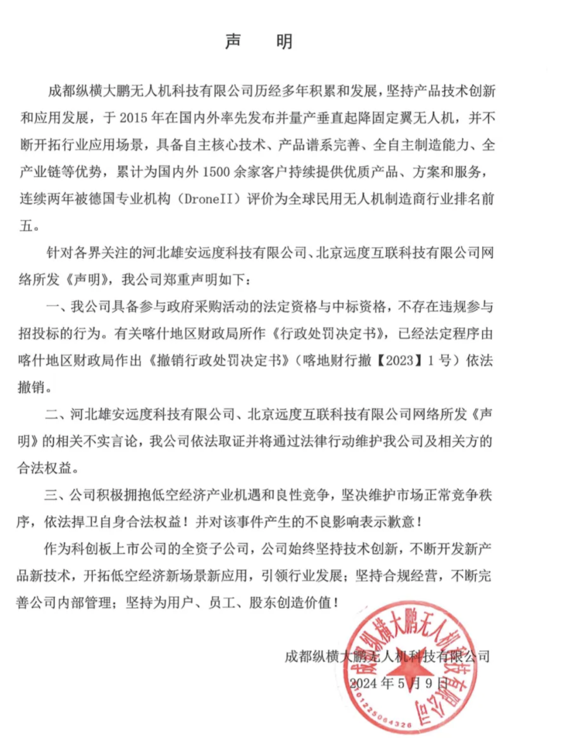 此前,远度科技5月7日在其官微发表声明称,纵横股份子公司成都纵横大鹏无人机科技有限公司存在伪造质量检测报告、伪造远度科技公章、逃避行政处罚等行为,前者将对上述行为继续追究,对伪造公章行为提出刑事报案。而该声明剑指纵横无人机在参与喀什地区林草局2022年中央财政林业改革发展资金采购项目招投标时的伪造行为。